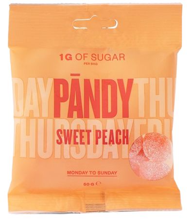 Pandy Candy Sweet Peach jsou sladko - kyselé gumové bonbony s příchutí broskve. Obsahují minimální množství cukru a téměř žádný tuk, také potěší obzvláště vysokým obsahem vlákniny v množství až 54 %. Skvěle se hodí jako nízkokalorická alternativa standardních želatinových bonbónů dostupných v supermarketech. Ideální jsou na cesty, nebo na domácí snackování.