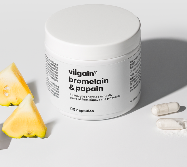 Vilgain Bromelain & Papain – podpora štěpení bílkovin, enzymy z anasu a papáji, silná dávka v rostlinné kapsli