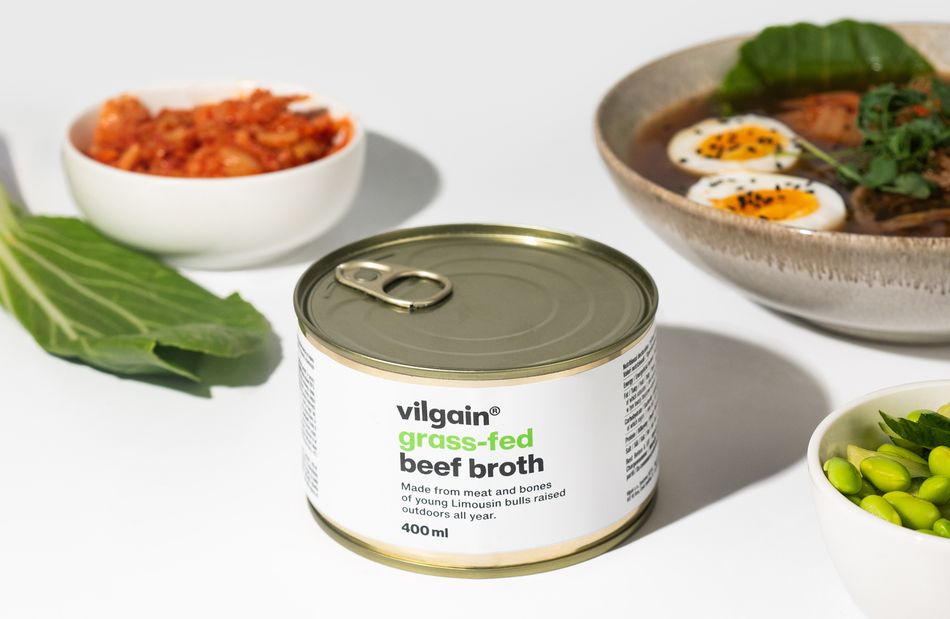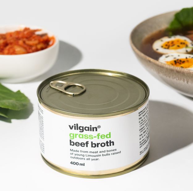 Vilgain Grass-Fed Hovězí vývar – hovězí vývar z grass‑fed masa, bez zvýrazňovačů chuti, v plechovce chránící před oxidací