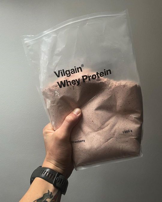 Ultrafiltrovaný nedenaturovaný syrovátkový proteinový koncentrát (91 %) (mléko, slunečnicový lecitin), jahody mrazem sušené v prášku (6 %), přírodní aroma, guarová guma (zahušťovadlo), sladidlo na bázi steviol‑glykosidů.