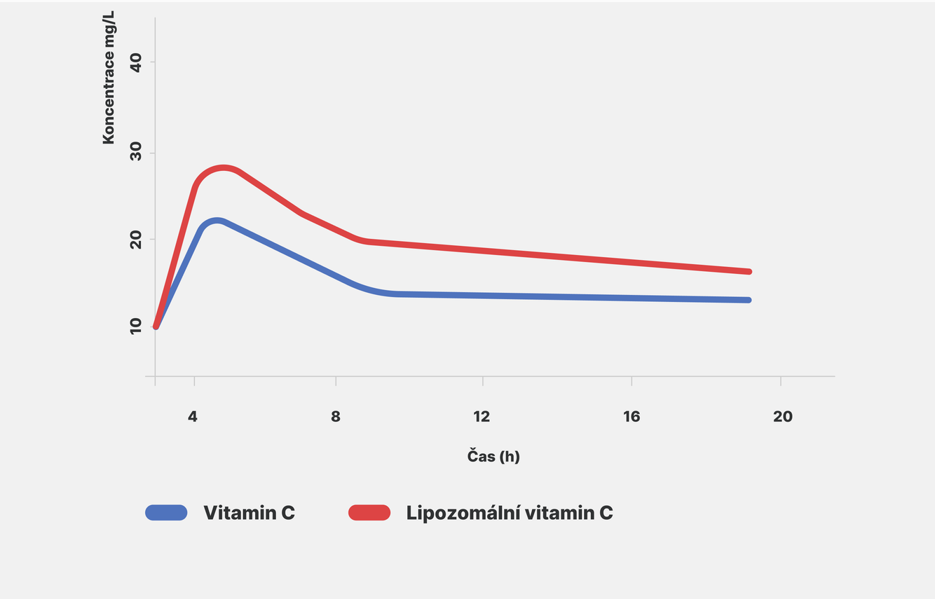 Graf znázorňuje vyšší biologickou dostupnost lipozomálního vitaminu C v krvi oproti běžné formě [4].