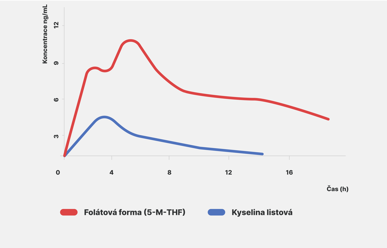 Porovnání vstřebávání kyseliny listové (FA) a aktivního folátu (5‑MTHF) v krvi [1]